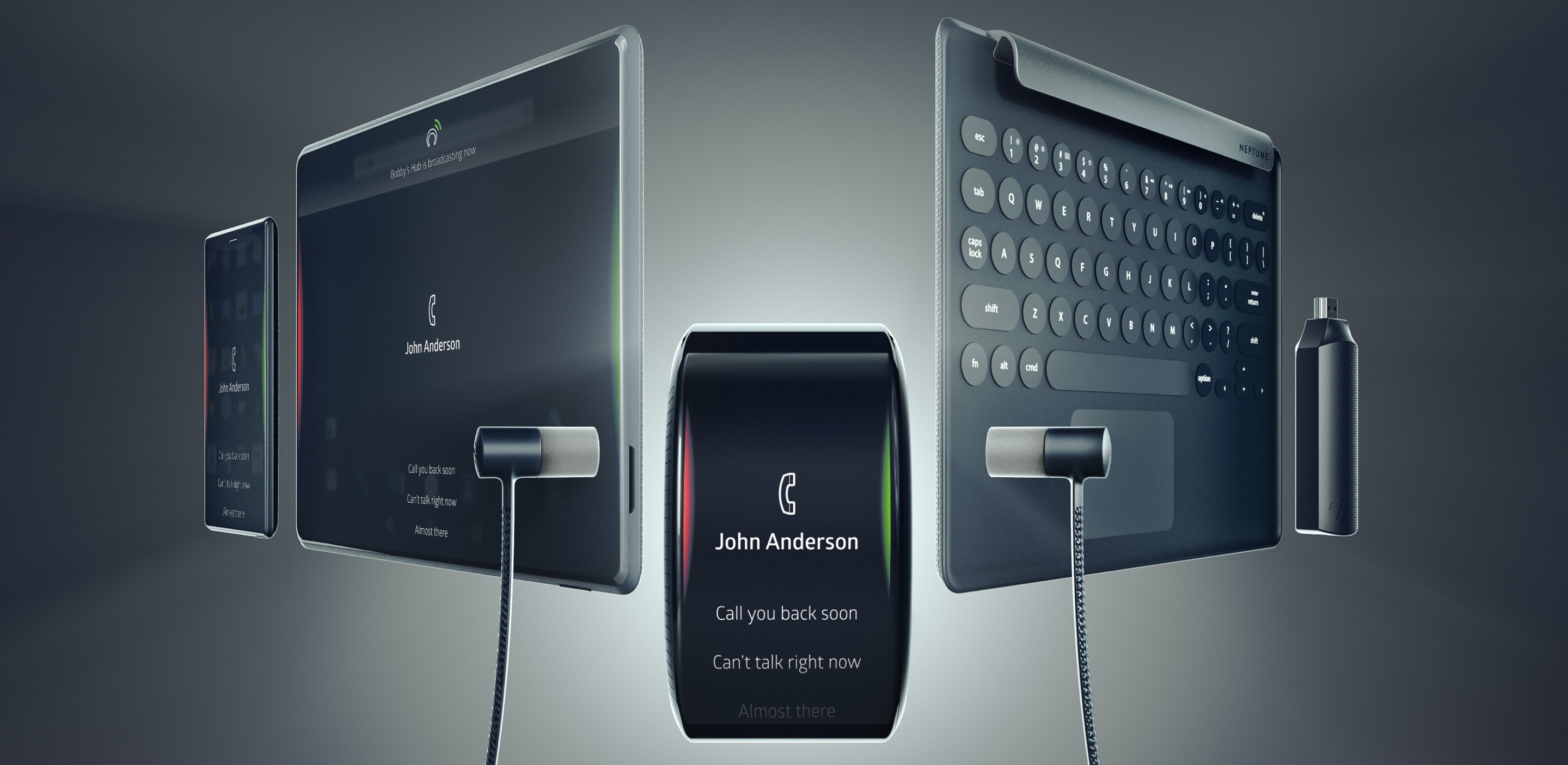 Imagine what it would be like to walk up to any display surface and have it be a window into your personal computer. You'd have access to your files, settings, apps, whether you're in your car, office, shopping mall or friends' house in the appropriate display size. To do this, we employed WiGIG technology, and created a bracelet hub and a suite of displays to compliment it.